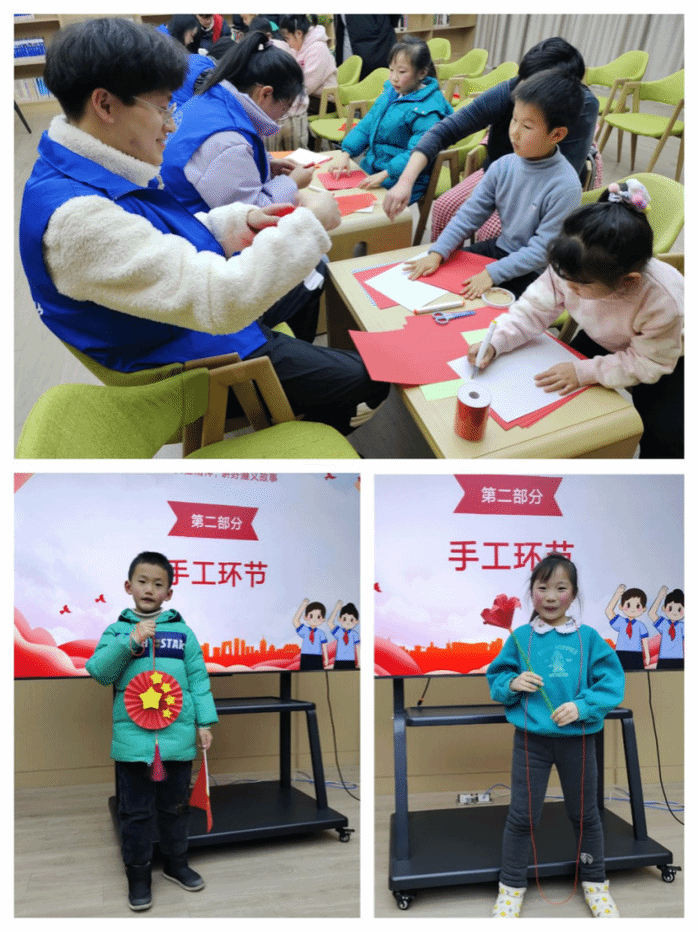在制作红色手工活动中,志愿者向小朋友发放制作材料,指导他们制作灯笼、花束等。小朋友们充分发挥思考能力和动手能力,认认真真地完成着属于自己的作品,不时向身旁的志愿者学习请教,营造了温馨和谐的活动氛围。