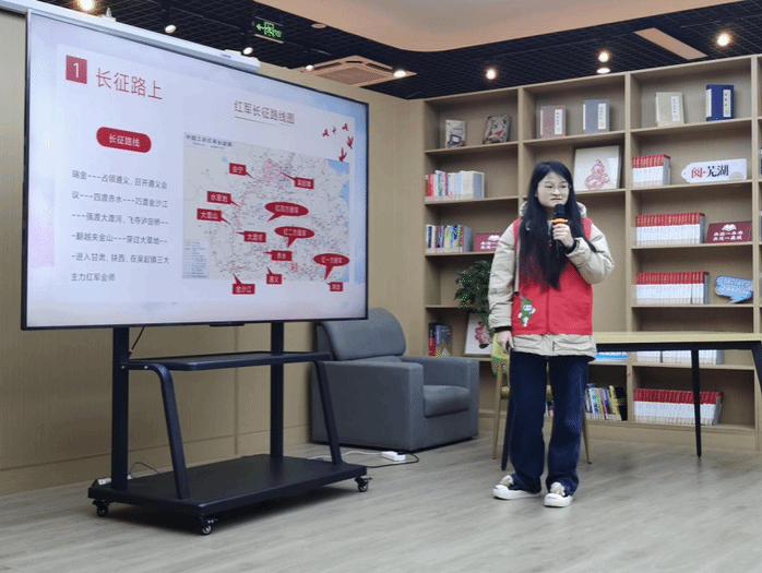 活动伊始,遵义会议精神宣讲人杨璐瑶同学以家喻户晓的长征故事为切入点,结合长征的时代背景和敌我军事力量数据对比,显示红军长征之“难”,引出遵义会议的绝处逢生,调动现场听众的情绪。接着,她围绕会议内容、历史意义、精神内涵展开论述,引用图片、视频史料,让在场听众对于遵义会议如何“挽救了党,挽救了红军,挽救了中国革命”有了更清晰的认知。