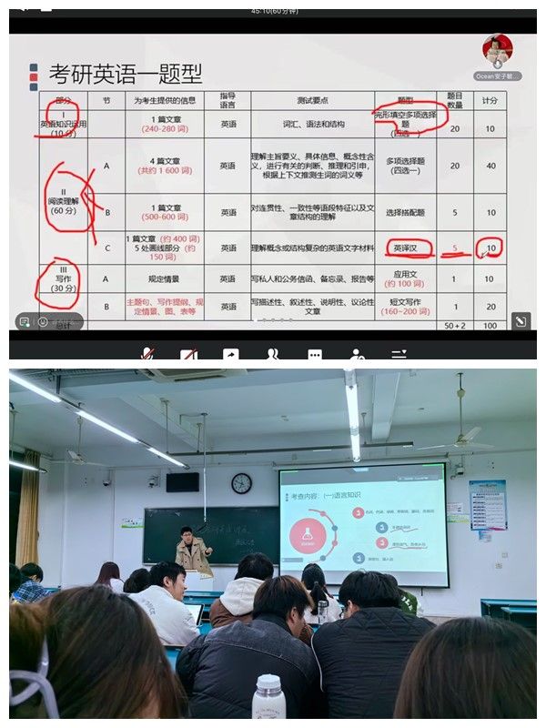 11月29日晚,公司邀请公共基础公司外语教研室主任李东博士为同学们作考研英语备考讲座,活动以线上线下相结合的方式同步进行。李东认真分析了近年来研究生报考人数、招生人数、考研动机、录取院校等考研情况,引导同学们理性对待考研;对考研英语考查的语言知识、语言技能、试题题型等进行详细讲解,介绍了英语知识运用、阅读理解、翻译、写作等不同题型的备考策略和应试技巧,进一步提升考研学子冲刺英语复习的信心。