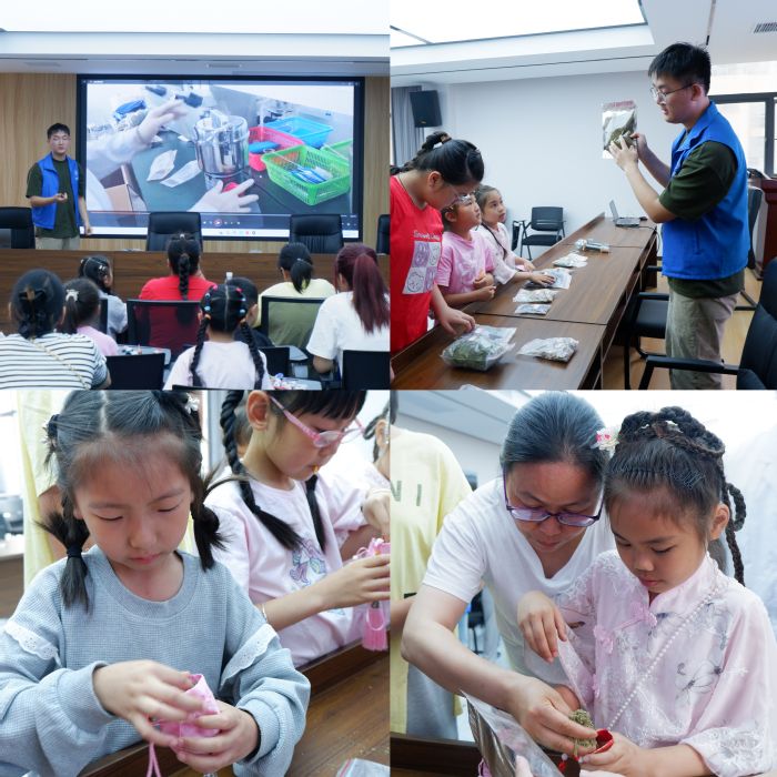 宣讲结束后,中药学专业的志愿者向小朋友介绍了常见的几类中药香囊,详细讲解了驱蚊防疫香囊中的香茅草、丁香、陈皮等12味原料药的功效,并以视频的形式向他们展示了中药香囊从原料药的粉碎、混合到成品的制作过程。活动现场弥漫着香囊清幽典雅的馥郁香气,孩子们有条不紊地学着制作香囊,灿烂的笑容跃然眼前。