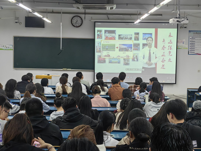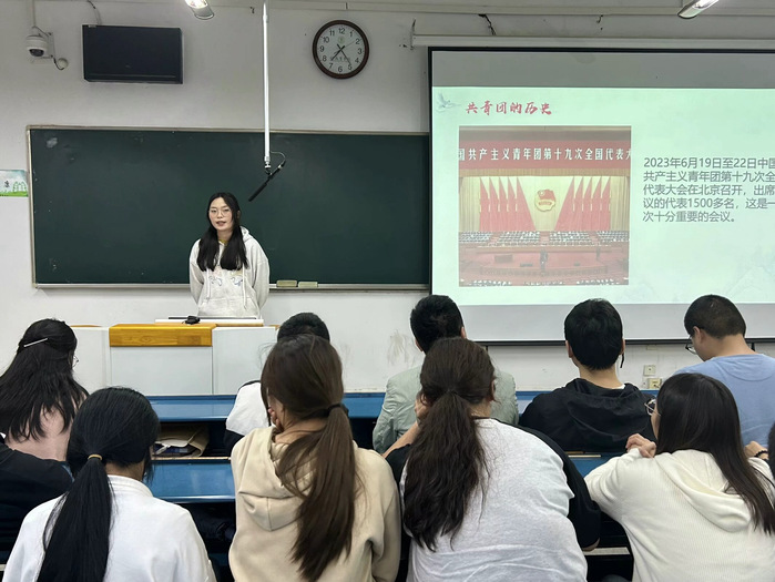 邬楠楠同学以“忆百年团史,悟青春担当”为主题,讲述了共青团的历史发展脉络,带领同学们学习团的百年奋斗史,呼吁青年学子们肩负责任,努力做走在时代前列的奋进者、开拓者、奉献者。