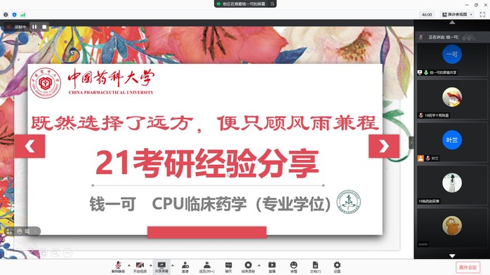 6月17日晚,2017级钱一可、江齐和、王妍、李泽朋、刘雨琪、李顺6名同学精心准备,从院校选择、时间安排、心态调整等方面出发,为2017级临床药学、2018级、2019级药学专升本同学进行了线上考研经验交流,并对同学们提出的问题悉心作答,大家纷纷表示受益匪浅,备受鼓舞。