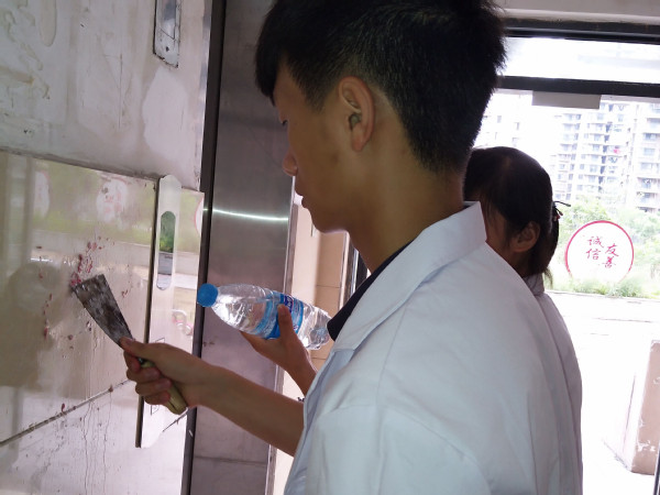 清理牛皮癣,共建美好家园。7月12日上午,芜湖三分队的队员们带着提前准备好的工具:小铲子、喷壶、抹布、扫帚、簸箕和纸篓,来到儒林西苑社区,为社区做一些义务清理工作。在物业工作人员的带领下,同学们兵分两路,一路清理楼道内及宣传栏上的“牛皮藓”,另一路负责捡拾社区道路上的果皮纸屑等垃圾。虽然活动中同学们做的都是平凡的小事,但是大家在劳动中懂得了:身边一些举手之劳的小事,同学们不是不能做,而是不愿做,每个人都可以伸出一双手,热爱并保护我们的家园。