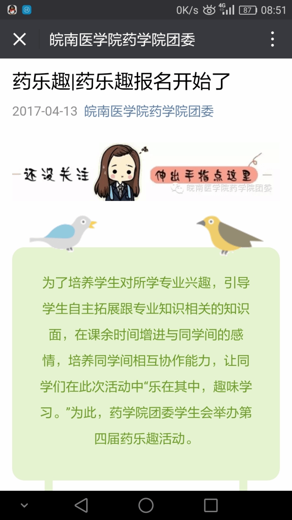 时间:2017-04-28 来源:宣传部 阅读次数:为积极响应校团委“三走”号召,增进同学间情感交流,提升同学们的专业兴趣。TapTap点点团委员工会于4月22日举办了第四届“药乐趣”趣味竞赛活动。