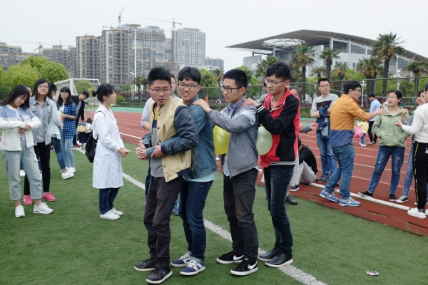 为提高同学们团队合作能力,增强团队意识和创新意识,2014级团总支员工会组织开展员工素质拓展活动。活动分为两个环节,即“群龙寻宝”和“心心相印”,以不同的形式要求参赛选手在配合中完成比赛。在“群龙寻宝”环节中,要求三位同学抬起一个同学,使其在身体不触碰地面的情况下,将气球拿回起点。“心心相印”环节的四人协助夹气球比赛更是受到同学们的热烈欢迎,将整场比赛推向高潮,场外加油声、助威声此起彼伏。