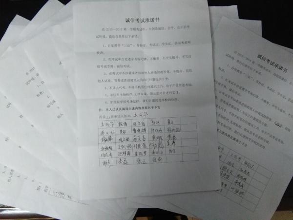 2015级员工自觉开展考试诚信承诺书签名活动,活动以班级为单位。各班班长宣读《诚信考试承诺书》,辅导员对其进行讲解,强调诚信考试的重要性,明确指出考试作弊的危害,每位同学在考试诚信承诺书上签名,表示以身作则,遵守考风考纪,拒绝作弊行为。签字活动不仅仅是一种形式,更重要的是为了践行社会主义核心价值观,督促同学们树立考试自律意识,端正学习态度,取得优异成绩。