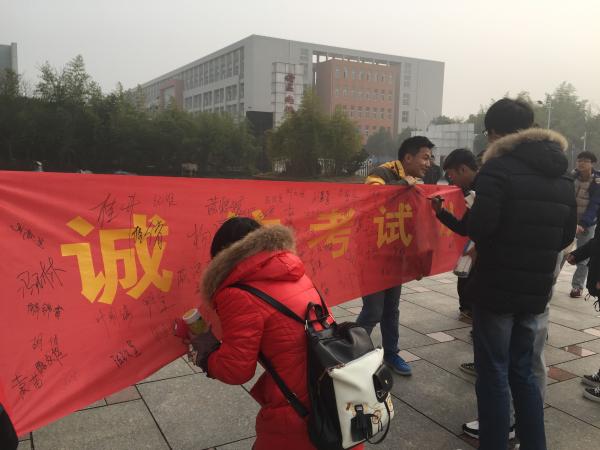 为进一步加强校园优良学风创建和员工诚信考试教育,创建优良学风、考风。12月25日中午,2015级团总支员工会在食堂一楼门口开展了学风建设系列活动之“诚信考试从我做起”横幅签名活动。活动中,同学们都积极响应诚信考试的号召,共同为诚信考试立下誓言,纷纷表示要以身作则,以诚信为自我要求,积极备考,拒绝作弊行为。此次诚信考试签名活动的开展,一方面,为了宣传诚信考试的重要性,增强员工诚信考试意识;另一方面,倡导员工在接下来的考试中,做好考试复习,重视诚信考试,将诚信考试意识和行为落实到日常的学习、考试中,形成诚信考试的优良学风。