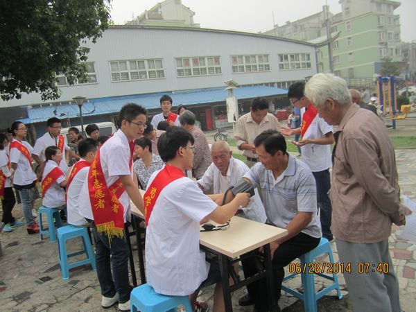 活动期间,同学们还身体力行于6月28日早晨六点左右来到鲁港社区开展义诊、宣传安全用药、提供健康咨询等活动,很多早起晨练的老人看到志愿者的到来,便主动的排队等待。志愿者们细心认真的为老人们量血压、耐心讲解日家庭常用使药规范、介绍夏季如何保持健康及合理饮食等。志愿者们积极热情的服务态度,细致认真的讲解得到居民们的称赞。社区管理者表示热烈欢迎这样的志愿者活动,希望志愿者们定期开展。