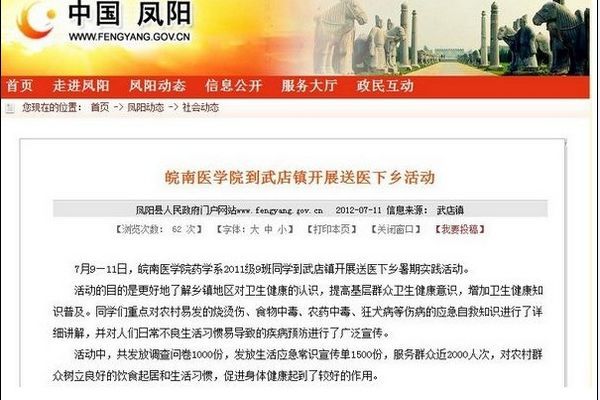 暑假期间,我系学子为进一步完善专业知识,开展了一系列调研活动,如“宣传药学知识 义务量血压”实践活动、“参观家乡医院 学习药学知识”专业实践活动、“青少年学习压力与心理健康调研” 活动等,其中,11级社会实践队联合凤阳县武店镇计生办、武店镇团委,开展了以“享受健康 珍爱生命”为主题的送医下乡社会实践活动,重点对农村易发的烧烫伤、食物中毒、农药中毒、狂犬病等伤病的应急自救知识进行了详细介绍,受到了当地群众和地方政府的热烈欢迎,引起了当地媒体的高度关注,凤阳县人民政府网站也对此进行了相关报道。