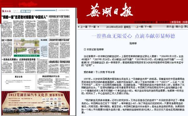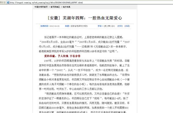 近日,芜湖日报、大江晚报、芜湖电视台报道了药学系青年教师年四辉无偿献血先进事迹,中国文明网,安徽好人网,芜湖文明网进行了转载,4月25日,芜湖教育电视台记者又来公司对年四辉老师进行了专访。