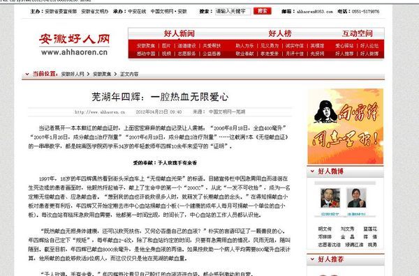 年四辉老师是公司药学系药剂与生药学教研室教师,早在1997年就加入了无偿献血的队伍,从此便与献血结下了不解之缘。在随后的日子里,他先后在合肥、昆明、南京、芜湖等城市参加捐献成分血和血小板,希望用自己的鲜血来挽救更多人的生命。据不完全统计其无偿献血共计约7200余毫升。如果按一个成年人全身血量为4000毫升计算,他献的血将近是他全身血液的两倍,并在2010年成为造血干细胞志愿捐献者。