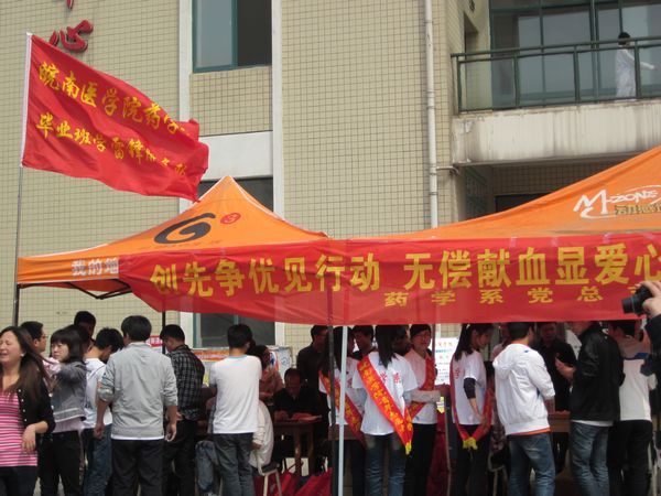 今年春节以来,芜湖市全市供血严重不足,为挽救更多宝贵的生命,药学系党总支积极主动联系芜湖市中心血站,商议献血相关事项。同时,药学系党总支在全系范围内,通过召开党支部会议、发放献血知识手册、开展校园广播、宣传栏等方式进行献血知识宣传,并通过宣传和讴歌身边师生的献血先进事迹和典型、联合校团委向全校发出无偿献血倡议书等方式,号召全校师生自愿参与无偿献血活动中。4月10日上午10时,准备献血的师生便早早来新食堂广场。随着芜湖市中心血站工作人员的到来,为期三天的“创先争优见行动,无偿献血显爱心”大型献血活动正式拉开帷幕。由于前期宣传工作到位,三天时间里,每天都有众多师生陆续加入到献血行列,在献血车前自觉排起了长长的队伍。虽然头上骄阳似火,但大家的热情更为高涨。参与献血的同学积极配合医生,按顺序进行领表登记、血型测定、体检和抽血。而药学系的各位领导和老师更是身体力行,踊跃参与到献血活动中。与此同时,药学系青年志愿者、毕业生党员服务队成员积极穿梭在活动现场,组织献血的同学有序排队、详细询问身体状况、叮嘱注意事项等,并积极主动向周围来往的师生宣传献血知识,许多兄弟系部的师生也加入到这场爱心活动中。