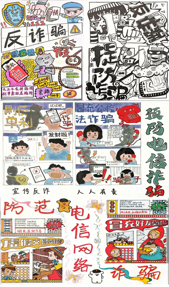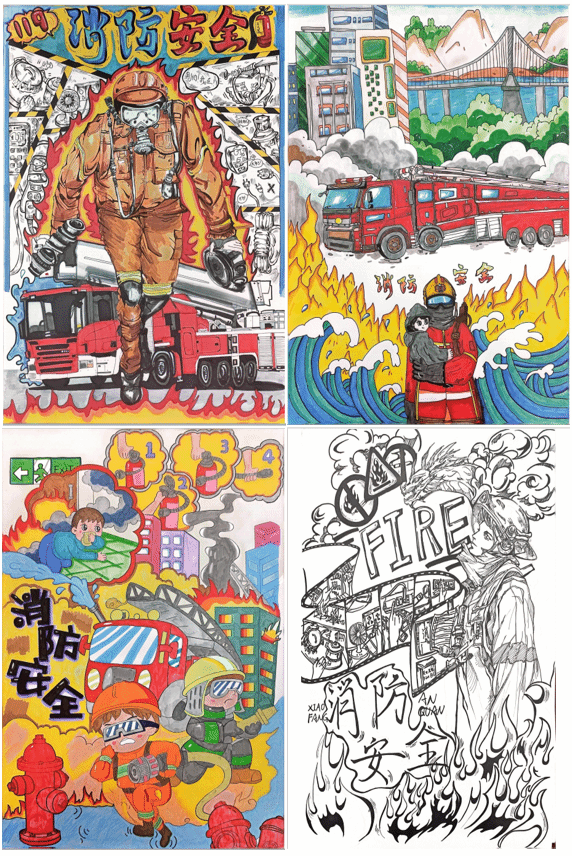 本次活动共收集“消防”主题漫画96张、“反诈”主题海报42张。同学们巧妙地将消防安全知识与反诈知识融入到创意海报设计中,色彩搭配与画面布局精巧和谐,兼具艺术感染力与视觉冲击力,生动形象地展现了火灾的预防措施及严重危害,揭露了电信诈骗的常见手段及防范方法,以独特的视角传递安全理念。