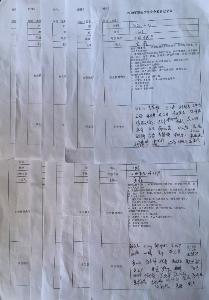 会上,辅导员结合具体的疫情防控、交通安全、火灾、燃放烟花爆竹、防止食物中毒、自我防护安全等多个方面讲述寒假安全注意事项。强调,因疫情防控形势仍存在诸多不确定性,要求同学们,寒假期间,尽量做到不聚会、不扎堆和不去人流密集的地方,勤洗手、勤测体温和佩戴好口罩,保持通讯手机畅通等。此外,还着重要求班干部关注班级同学假期思想动态,提醒同学们合理利用假期时间,努力学习、加强锻炼,增强体质。