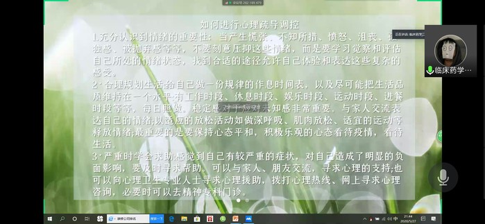 用“心”抗疫,我们在努力!2019级开展了“525”线上心理健康教育主题班会。班会主要围绕疫情对中国造成的影响、疫情期间出现的心理问题,怎样进行心理调控和疏导以及树立正确的人生态度等四个方面展开。活动通过生动的案例分析和形象幽默的图片展示,让同学们了解心理自我调节的方法、讨论各自在疫情期间的心理变化,分享自己的调节方式。班会现场讨论氛围浓厚,同学们都打开心扉,畅所欲言。通过这次活动,帮助同学们在疫情期间加强心理调试,增强心理免疫力,有效地维护心理健康。