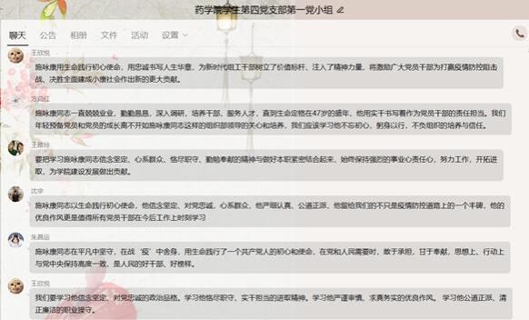 学习抗疫先锋事迹 争做当代优秀党员。为落实《中共安徽省委组织部关于开展向施咏康同志学习的通知》要求,支部第一党小组认真学习了《用生命践行使命——施咏康同志先进事迹》,并观看了施永康同志先进事迹的新闻报道。支部党员在学习结束后踊跃发言,积极交流学习心得与感想,同学们结合发生在社区、城市和国家的种种先进事迹,表达了在此次疫情中对党、国家和全体中国人民的敬意。尤其是以施咏康同志为代表的一大批当代党员们,他们虽然是父亲、母亲、儿子或者女儿,但在国家和人民最需要他们的时候,他们没有丝毫顾虑,冲上抗疫一线,活跃在大街小巷和社区楼道,为百姓排忧解难,为社区协调物资,为国家和人民争取宝贵的抗疫时间。