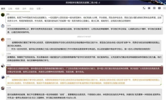 了解防控科研攻关 增强爱国爱党情怀。支部第三党小组组织在线上学习了习近平总书记在北京考察新冠肺炎防控科研攻关工作的相关报道。习近平总书记在考察中强调,人类同疾病较量最有力的武器就是科学技术,人类战胜大灾大疫离不开科学发展和技术创新。要把新冠肺炎防控科研攻关作为一项重大而紧迫任务,综合多学科力量,统一领导、协同推进,在坚持科学性、确保安全性的基础上加快研发进度,尽快攻克疫情防控的重点难点问题,为打赢疫情防控人民战争、总体战、阻击战提供强大科技支撑。之后,同学们还观看了《疫情下的城市与人们》和《总书记指挥这场人民战争——白衣执甲》两个与疫情有关的视频。