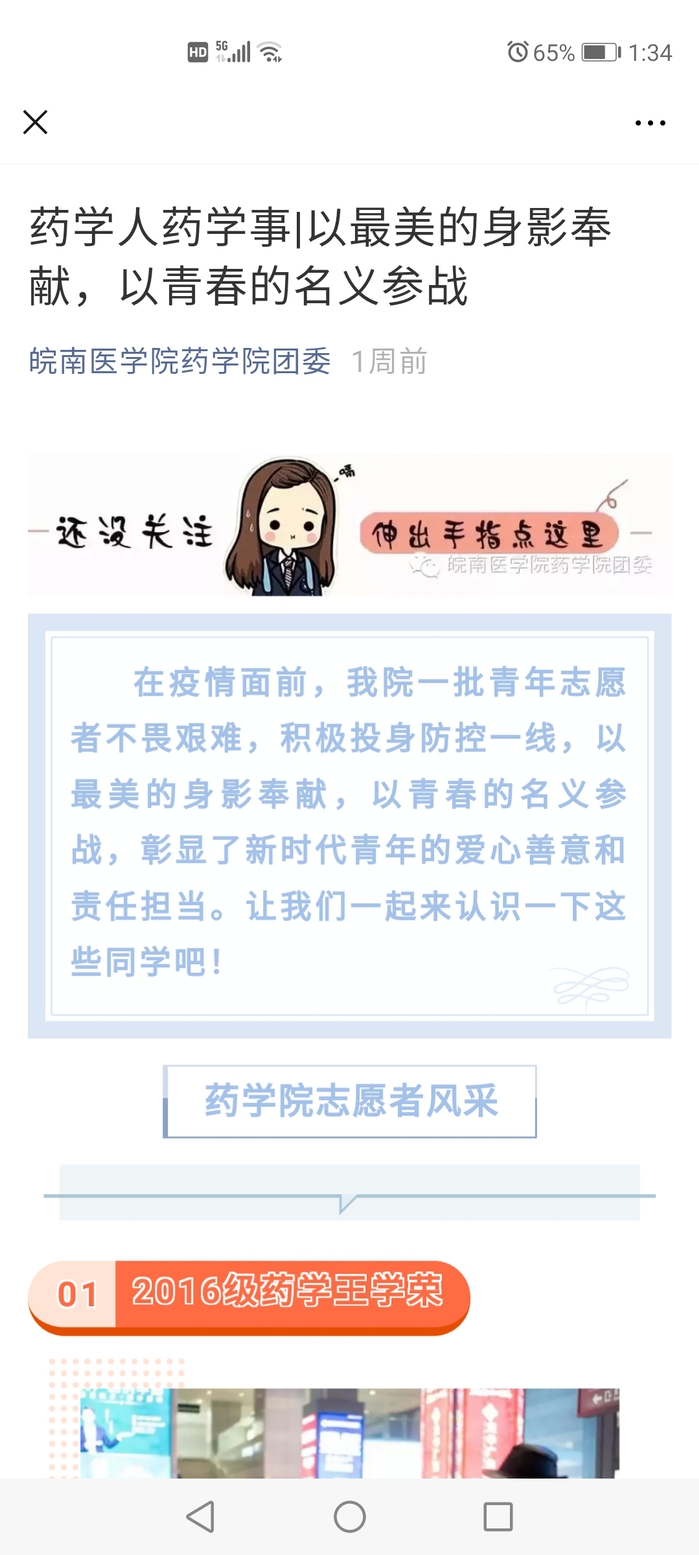 献青春,志愿者们在行动。在抗“疫”志愿者队伍中,活跃着药学青年学子的身影。芜湖火车站为乘客测量体温的2016级王学荣、协助社区检查登记外来人员的2017级许贝、向社区居民宣传防疫知识,指导口罩正确佩戴方法的2018级杨中洋,在医院预检分诊台志愿服务的2019级张雪娜,他们用自己的信心、爱心和担当,诠释了社会主义核心价值观的深刻内涵,丰富了青春年华的美丽人生。