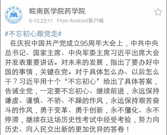 紧密团结党中央,永远跟党走。公司通过团委微博、微信以及QQ平台进行“不忘初心跟党走-永远跟党走”的主题推送,积极引导广大团员紧密团结以习近平同志为核心的党中央,在思想上、政治上、行动上与党中央保持高度一致,加深了广大团员青年对社会主义核心价值观内容的认识与领悟。