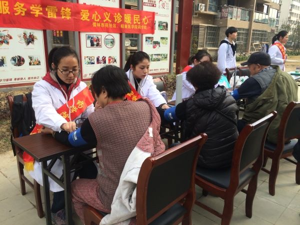 义诊服务传精神,志愿活动展风采。3月4日,“迎春”志愿服务队在儒林西苑志愿广场开展了主题为“志愿服务学雷锋,爱心义诊暖民心”义诊活动。志愿者们耐心细致的为社区居民测量血压、分析测量结果,并提出合理饮食、注意休息等建议。志愿者们热情周到的服务吸引了近百名居民的广泛参与,赢得了大家的好评。