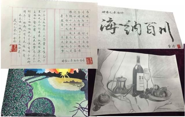 活动消息一经传出,得到同学们的热烈响应,截止到活动征集结束共收到50余幅书画作品,有书法类和绘画类,书法有硬笔、毛笔等,饶辰辰同学的《六朝镜》工整隽秀、挥洒自如,吸引了同学们的眼球,让人感受到书法的魅力;绘画有彩画、素描等,形式多样、笔墨淋漓、色彩斑斓,尽显同学们的书画功底,展现出多才多艺的精神面貌。