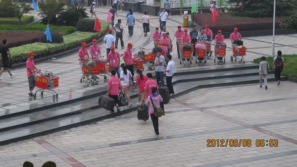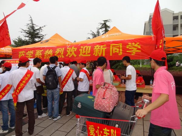 针对很多新生和家长远道而来,旅途奔劳,行李又很多,十分疲惫的特点。药学系青年志愿者在系领导的大力支持下,经过精心策划,筹集到20辆超市推车,组成了一支帮助新生搬运行李的“爱心车队”, 帮助新生将行李运到宿舍和领取卧具。这一温馨的举动让新生和家长感到了公司的关怀。