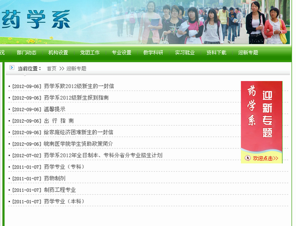 药学系在新生报到前,就专门在系部网站开设了 “迎新专题”内容包括“致新生家长的一封信”、“出行指南”、“2012级新生报到指南”等,让2012级新生在家期间就能通过网络了解整个入学流程。