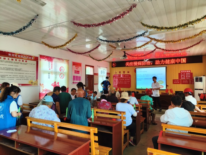 活动现场设立内科、外科、眼科、心电图检查、用药咨询、血压、血糖测量等窗口,医护工作者与志愿者们不畏酷暑,耐心服务当地居民,通过心电图、血压、血糖等诊断结果,有针对性地向村民宣讲如何通过改善饮食、运动习惯来提高身体素质,提倡低盐少油的饮食方式,提醒老年人要清淡饮食,平时加强锻炼,提前预防糖尿病、高血压等慢性疾病。活动现场,师生志愿者还开展了保健品与药品认知问卷调查,对居民提出的各种问题进行耐心解答,并为村民们发放了仁丹、十滴水、清凉油、花露水、驱蚊香囊等防暑驱蚊用品。
