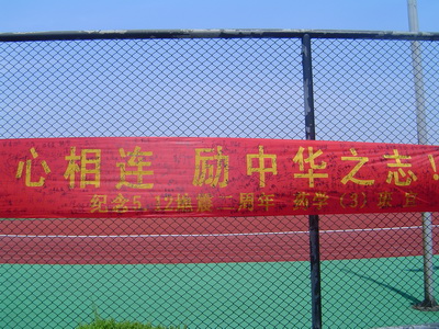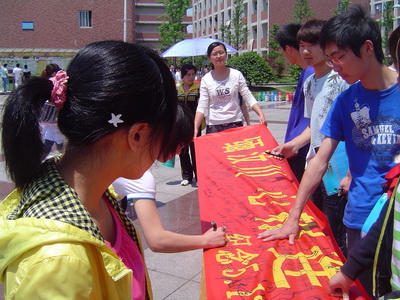同学制作了“缅汶川、心相牵、励中华之志”的横幅,邀请全校师生签名,祈福遇难同胞,激励同学们积极向上,为祖国的繁荣富强奋斗。本次活动得到了全校师生的支持,大家踊跃签名。活动后签名横幅悬挂于风雨操场旁,表达我们的缅怀之情、奋进之志。