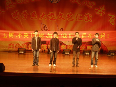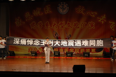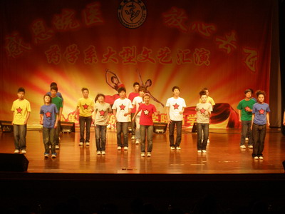 悼念活动后,晚会在开场舞《Together》中拉开序幕。在接下来的节目中,器乐合奏《要》、《灵魂颂》、吉他串烧《青春那些事》展现了公司员工的多才多艺,用音乐的形式诠释着当代老员工奋发向上的精神面貌;歌曲《田径之歌》、《不再犹豫》一展药学系体育健儿风采;歌曲《梦田》、《天涯》、歌伴舞《青花瓷》、舞蹈《苗岭的早晨》、《床前明月光》,同学们用优美的歌声、曼妙的舞姿充分展示了新时代青年的青春活力;配乐诗朗诵《那一年,我们正年轻》、《赋别》、话剧《相识相聚》等节目为大家再现了校园生活的活泼、温馨场景,讲述了即将奔赴实习单位的07级同学们在皖医成长、成才的历程,流露出对未来生活的美好憧憬;舞蹈《Nobody》、《Touch me》、歌伴舞《精舞门》,以热情奔放的舞蹈向人们展示了学子们的蓬勃向上的朝气;师范附小的同学们活泼可爱的韵律操《金色年华》和令全场捧腹的脱口秀《小沈阳新说》,使晚会高潮迭起,掌声如潮。最后,师生同台的节目《放心去飞》,表达了老师们对即将远行同学的殷殷期盼,同学们对母校的眷念与不舍。晚会在同学们的祝福歌声中落下帷幕。