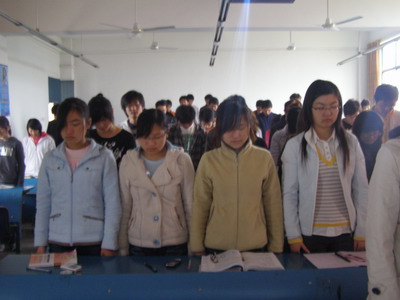 此次活动是同学们自发组织进行的,准备上课的教师也自愿参与进来,伴随着“全体起立,默哀三分钟”,当全体同学把头低下的瞬间,整个教室气氛变得很凝重,让人感到当地震来临时,生命的脆弱与尊严,在这三分钟里,可以感受到此时的玉树正在承受着失去亲人和家园的痛苦。