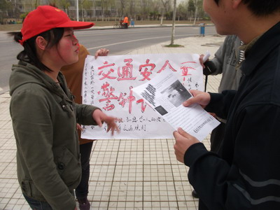 3月20日上午,药学系09级制药工程(2)班的同学围绕“遵守交通规则,珍爱生命”的主题,开展了走街头向行人宣传交通法规的活动。