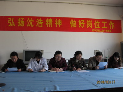 时间:2010-03-18 来源:人员机构 阅读次数:3月17号下午,药学系教工一支部开展了“弘扬沈浩精神,做好岗位工作”的组织生活会。此次会议由药学系教工一支部书记惠斌主持,教工一支部全体党员参加了此次组织生活会。
