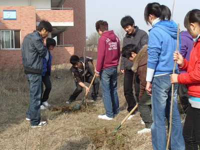 药学系青年志愿者服务月活动之三: 09级团总支组织开展“义务植树,绿化校园”活动