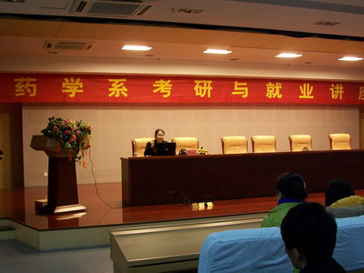 整个讲座分三部分,第一部分主讲药学员工的就业情况,贾老师从不同角度、不同层次为我们剖析了药学员工的就业现状,内容丰富多彩,表达淋漓尽致,聆听讲座的同学心悦诚服、如沐春风;接着为我们展开了本次讲座的重点:考研。贾老师通过个人以及众多成功人士的经历,阐述了药学的考研方向、有关知名院校以及如何备考,传授了个人的成功经验,使同学们受益匪浅;最后是现场答疑,同学们积极踊跃,纷纷提出了自己在考研还是工作这个抉择中存在的各种疑惑,贾老师一一作了精彩的解答,整个报告厅掌声连连。