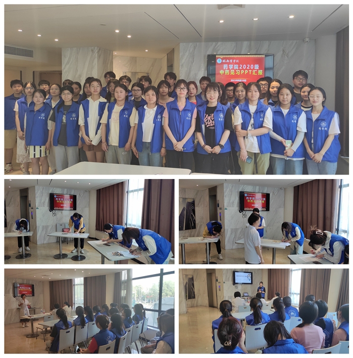 在辨药考核环节,同学们通过眼观形状、大小、色泽,手摸质地、断面,鼻闻气味等,辨识中药桌上摆放的20味中药,并根据亳州之行所学知识,分成四个小组进行PPT汇报展示和总结,进一步推进落实以赛促学、以赛促教。