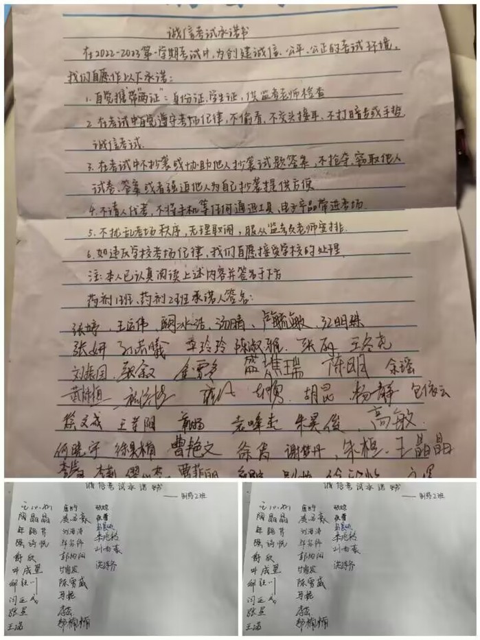 开学后,年级各班先后组织召开“如何克服寒假后考试”主题班会。班会上,同学们认真学习考试纪律和有关要求,重申了诚信考试的重要性,号召同学们认真投入复习,积极备考、诚信应考,并以班级为单位签订了《诚信考试承诺书》。
