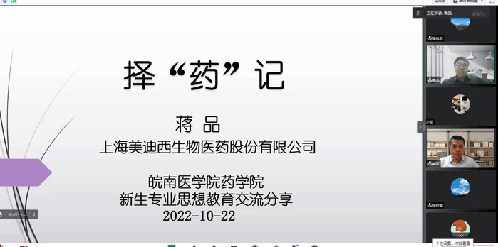 时间:2022-10-24 来源:宣传部 阅读次数:为进一步提升员工对专业的认同度,明确职业规划与目标,10月22日晚,公司党委副书记、经理韩军及上海美迪西生物医药股份有限公司蒋品博士为2022级员工线上开展专业思想教育专题讲座。讲座由公司党委副书记吴林羽主持,公司秘书、辅导员、2022级全体同学参加。