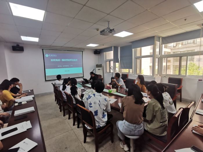 王慧以《如何完成一篇优秀的毕业论文》为题,从论文的摘要、绪论、正文、总结、参考文献、致谢六个部分进行了讲解,以具体的论文题目为例和同学们展开互动,指导同学们筛选有意义的论文内容开展研究,顺利完成毕业论文写作。