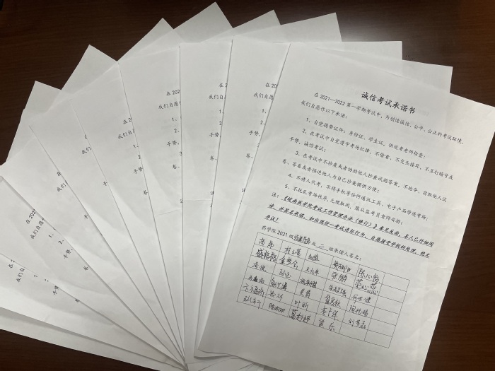 紧抓学风建设,树立诚信考试氛围。为严明考风考纪,帮助2021级员工形成诚信品质、良好考风。2021级辅导员组织各专业同学认真学习了公司“诚信考试”相关管理办法,同学们纷纷签署了《诚信考试承诺书》,并表示将保持严谨求实的学习态度,端正考风,以真正实力争取优异的成绩,以诚信展现良好学风、考风。