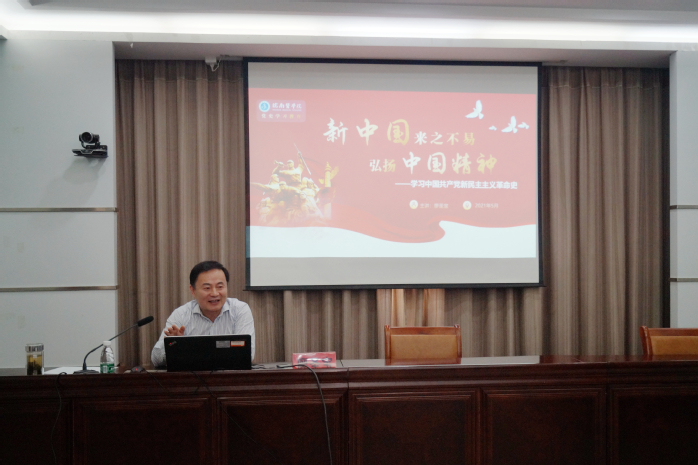 廖圣宝围绕“共产党早期组织的建立”,讲述历史选择共产党的正确性;围绕“中共一大的召开”,带领师生回顾历史,就“红船精神”的历史地位、深刻内涵与现实意义进行了详细阐释;围绕“井冈山斗争、红军长征和延安岁月”,讲述中国共产党岁月峥嵘,展现了不忘初心,牢记使命,艰苦奋斗的精神状态;围绕“抗日战争和解放战争”,讲述了火热的战斗生活,展现老一辈革命英雄人物矢志不移、百折不挠、大公无私、英勇顽强的革命精神和家国情怀。中国共产党立志千秋伟业,百年来实现了中华民族从东亚病夫到站起来的伟大飞跃,实现了中华民族从站起来到富起来的伟大飞跃,中华民族迎来了从富起来到强起来的伟大飞跃。教育引导同学们学史明理、学史增信、学史崇德、学史力行。坚定理想信念,厚植爱党爱国情怀,永远跟党走。