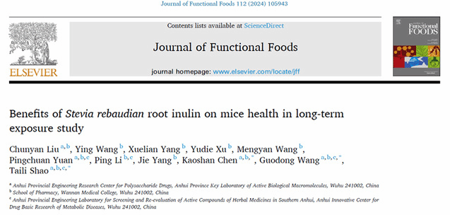 时间:2023-12-28 来源:TapTap点点 阅读次数:TapTap点点本科生汪滢、杨雪莲、徐玉蝶等同学,在柳春燕等教师的指导下,开展了甜叶菊根多糖功能的研究,发现甜叶菊根多糖对脂肪肝预防效果明显,具有潜在的应用前景。研究成果在国际刊物Journal of Functional Foods(中科院二区,IF=5.6)上发表了题为“Benefits of Stevia rebaudian root inulin on mice health in long-term exposure study”的研究论文。
